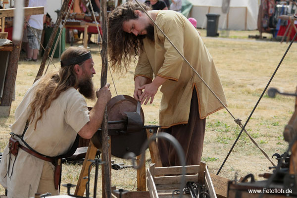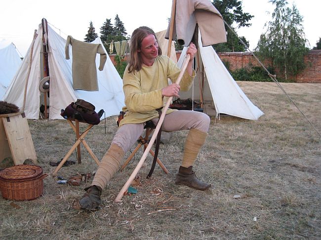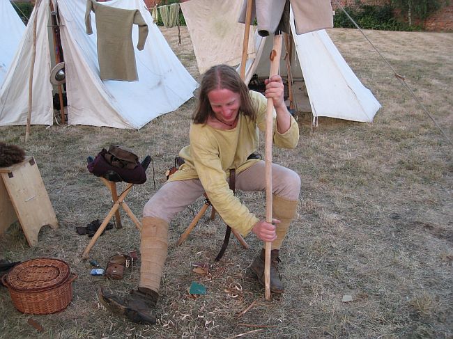 Der Schaft von unserem kleinen Ger ist kaputt gegangen. Alex fertigt aus einem gefundenen Stück Holz einen Neuen |
